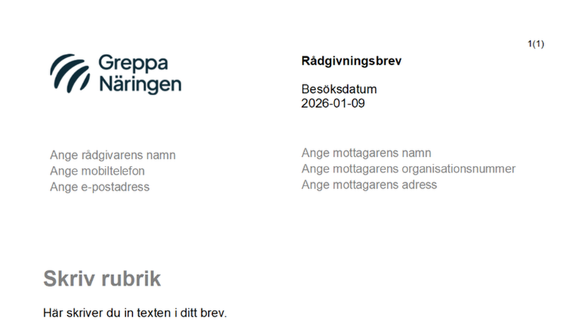 Använd den här mallen när du skriver rådgivningsbrev inom Greppa Näringen. I flera rådgivningsmoduler finns också exempelbrev som kan hjälpa dig när du tar fram ditt eget underlag.